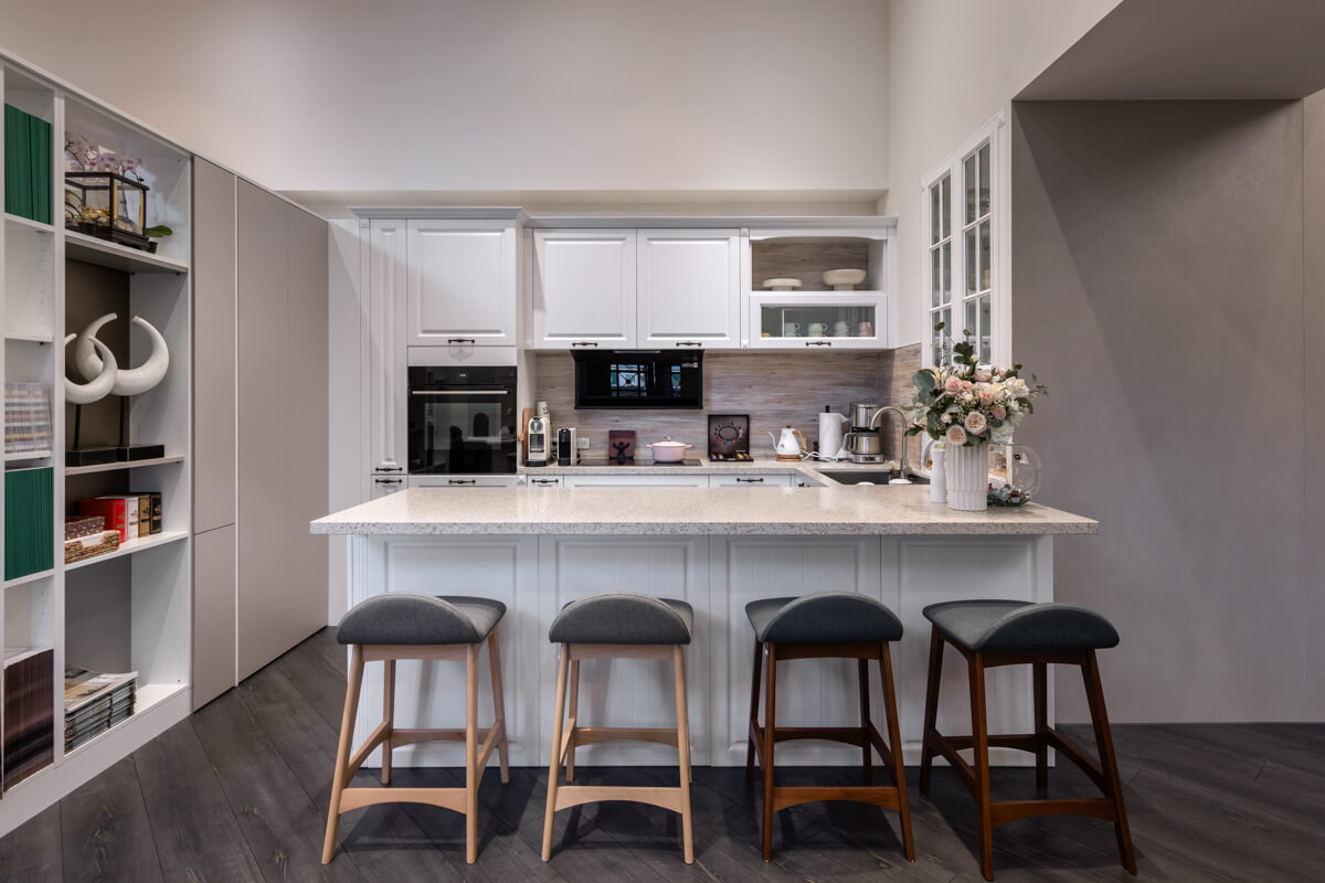 烤漆系統門片搭配溫潤石紋,勾勒出英式鄉村廚房的優雅基調。