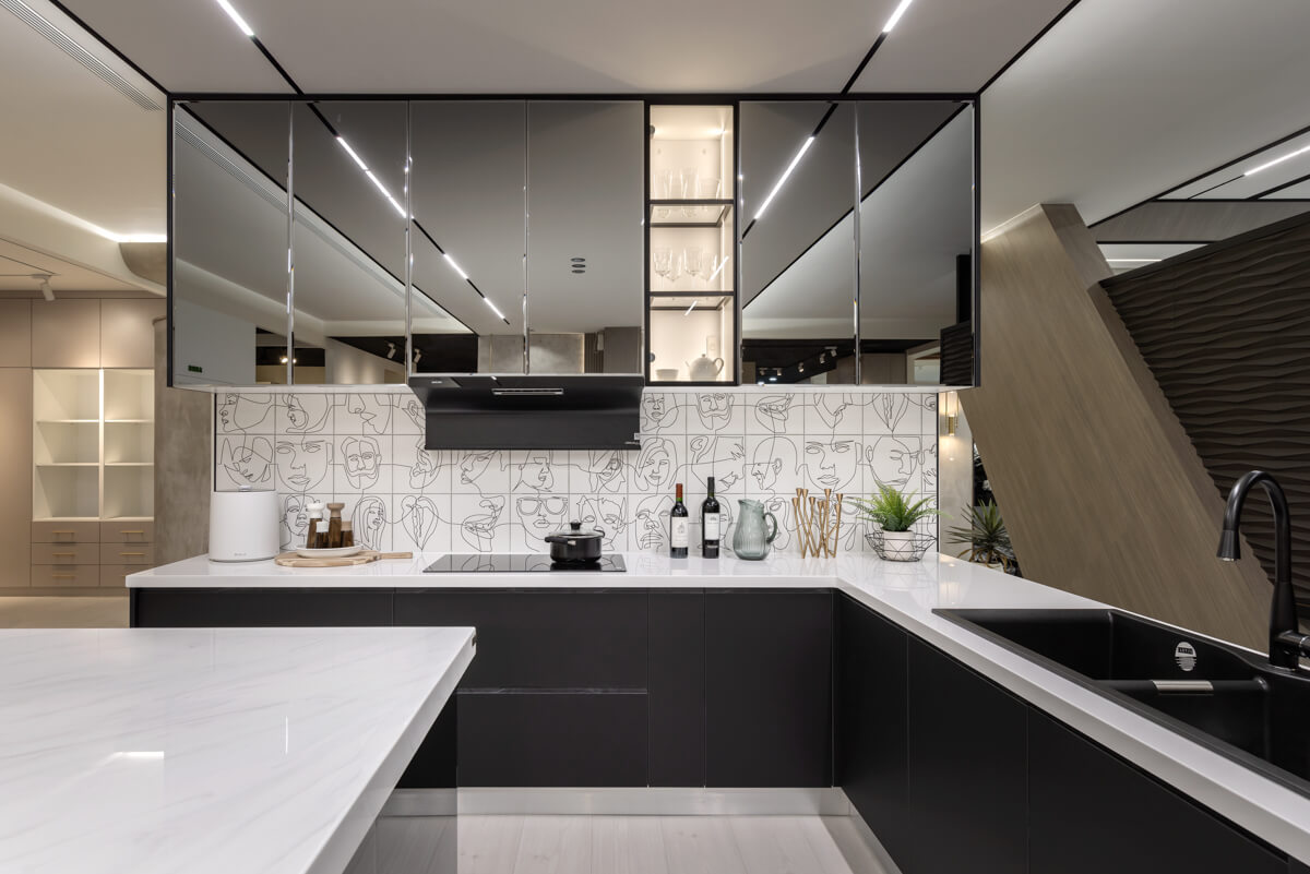 藉由系統廚櫃高訂製的特性,讓儲物收納分隔有序,釋放寬闊空間。