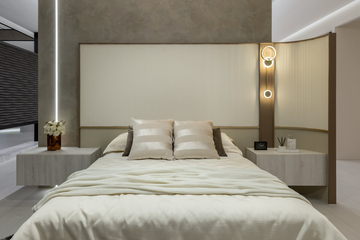 柔情的古典浪漫,低飽和色彩基調與優雅相契,尺度與品質之間塑造出怡然純粹,大面積的造型線條牆面做為臥室空間的亮點,顯得靈巧而通透。