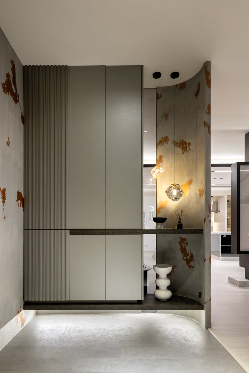 藝術塗料與立體圓弧感搭配,拉高視覺上的比例,讓玄關空間更顯恢弘豪華。