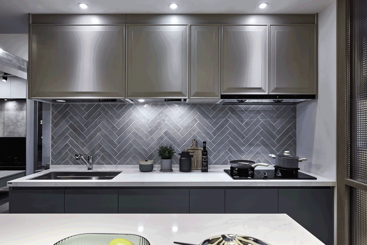 一字型廚房:櫥櫃設計除了收納跟檯面之外,其實門片的選擇學問也很大,在高溫高油煙的廚房中,烤漆門片質地堅硬且耐熱耐水的特色,表面光滑也好清潔,造型豐富多樣,不論現代簡約或是古典優雅都能輕鬆營造其氛圍,造型花磚點綴讓其達到分區的雙重效果,營造現代摩登的櫥櫃設計