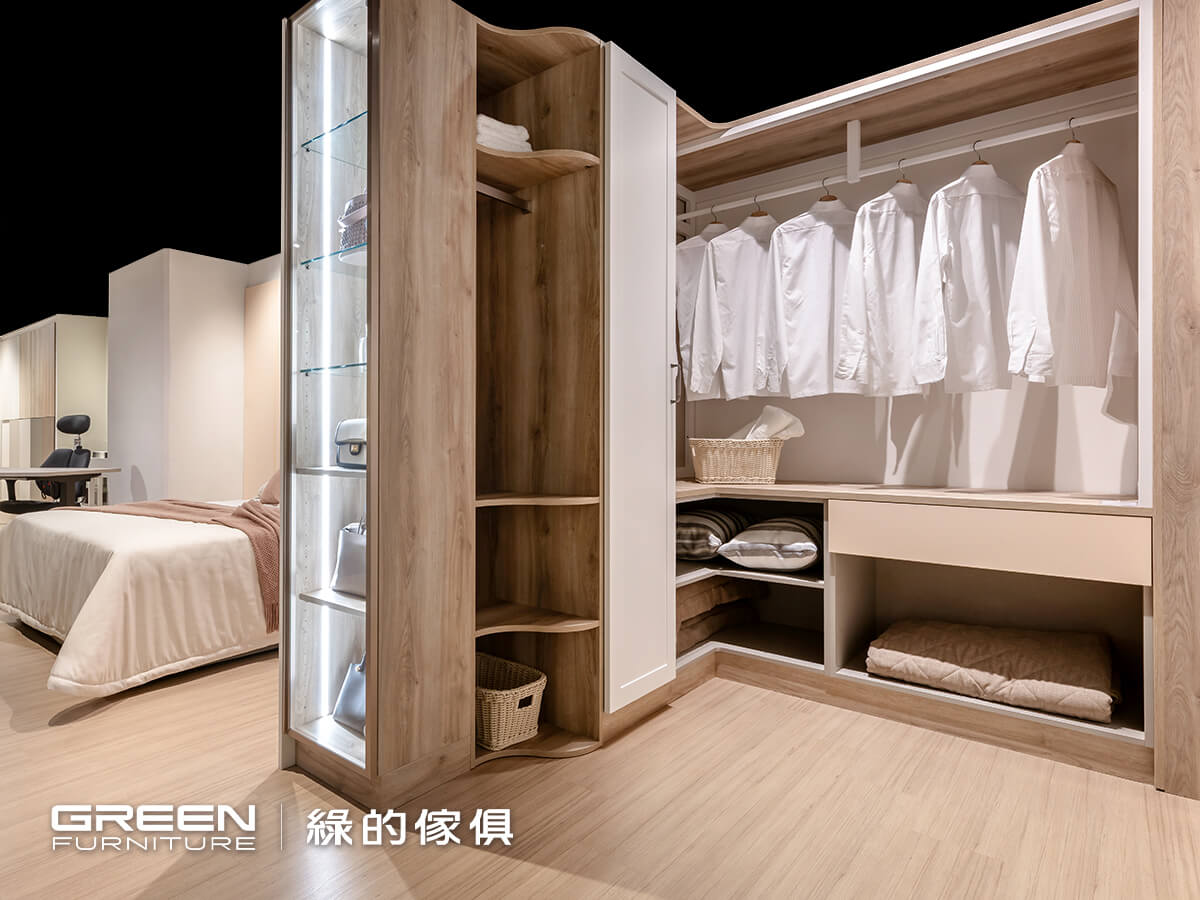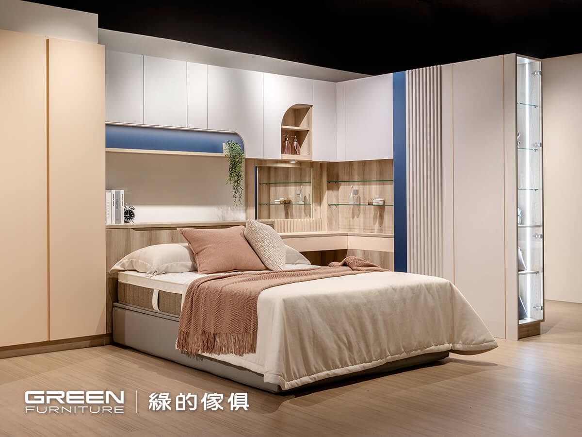 柔霧色調與木質肌理交織出放鬆的臥室氣息,搭配俐落的線條與隱藏式收納設計,營造出乾淨、靜謐又具生活感的居家氛圍。這樣的設計不僅美觀,也讓每一寸空間都能被細膩利用,展現綠的傢俱一貫的「高機能美學」。