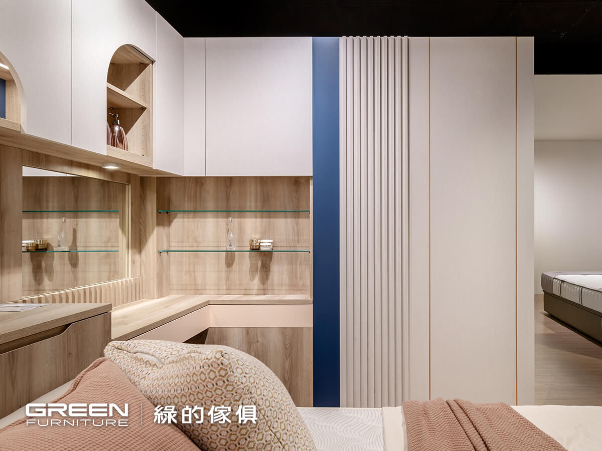 設計師透過「水平延伸的櫃體佈局」與「垂直比例的平衡掌握」,在視覺上放大空間感。轉角區域以L型收納櫃+懸浮式檯面的組合手法,兼顧臥室系統傢俱的設計美感與功能,形成自然的動線轉折與空間過渡。