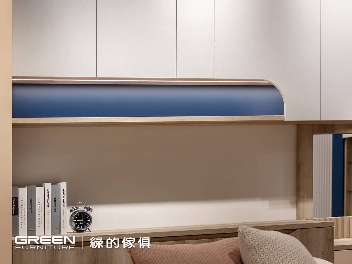 床頭上櫃門片以弧形開口設計增添層次感,開放格與封閉櫃的搭配,兼顧展示與收納。