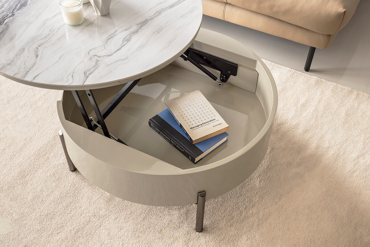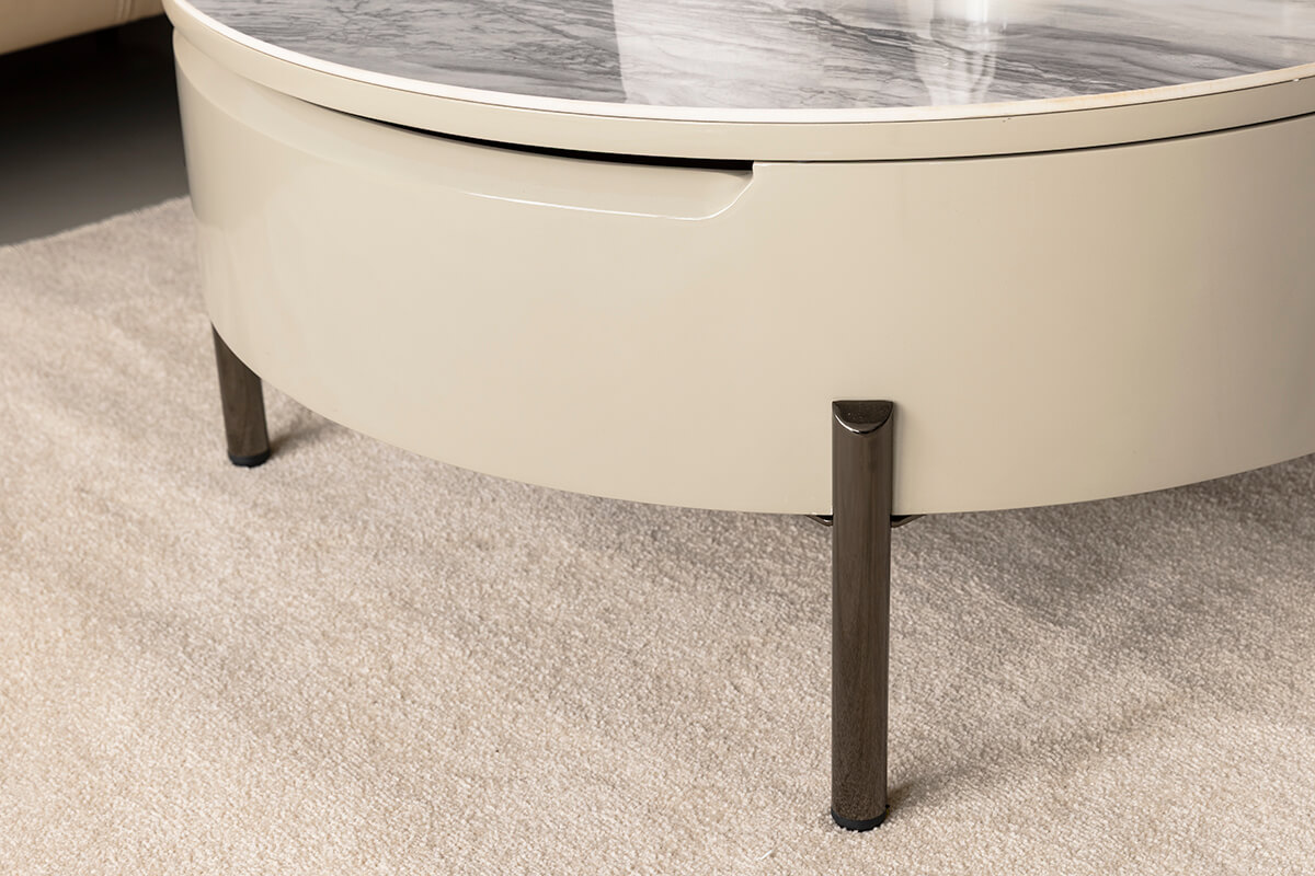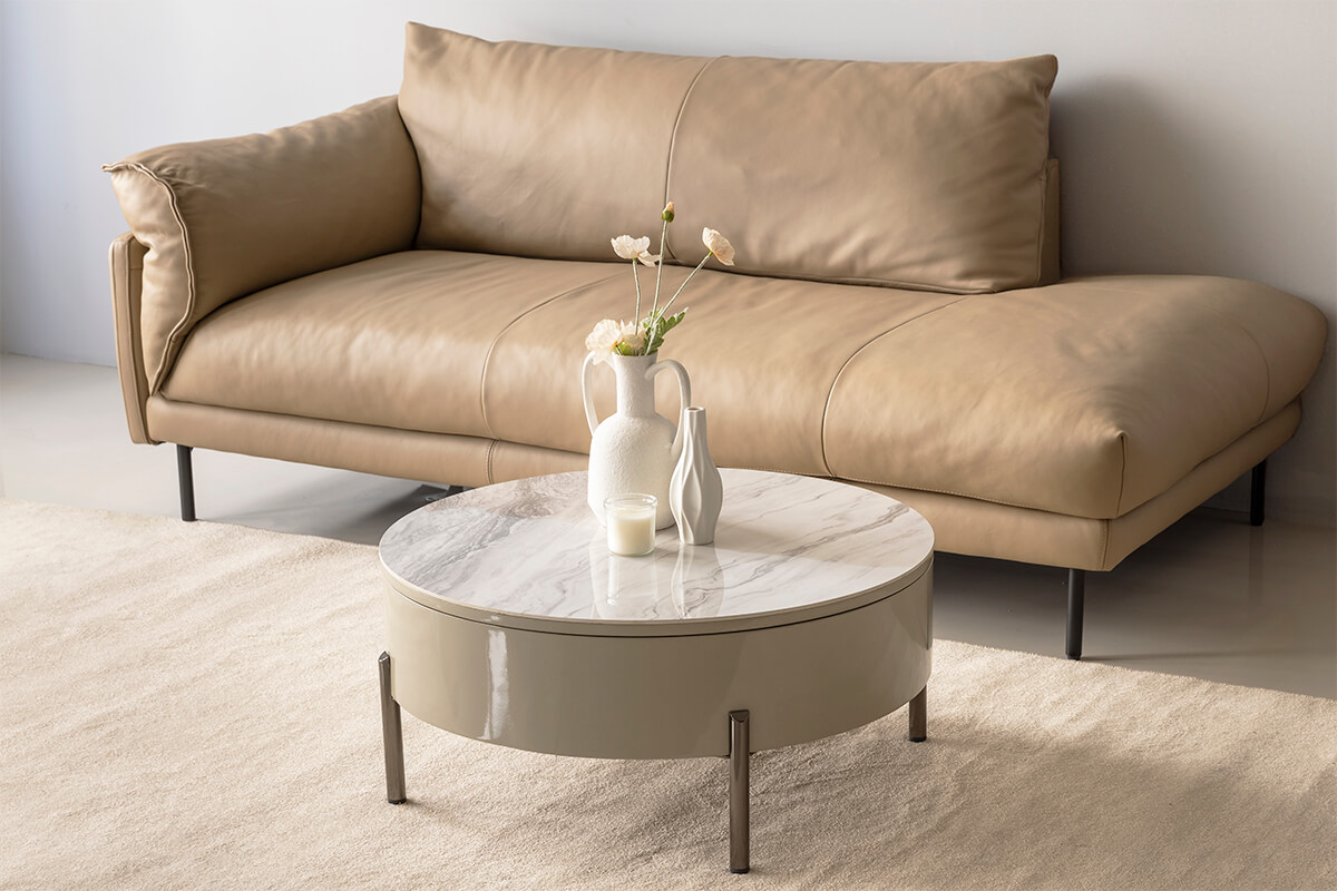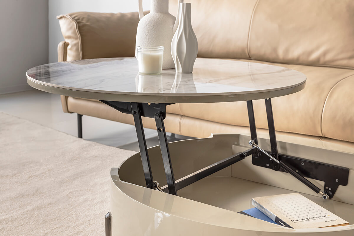 岩板升降茶几從檯面往下運用深淺色皆的堆疊,營造視覺上的舒適與奢華。