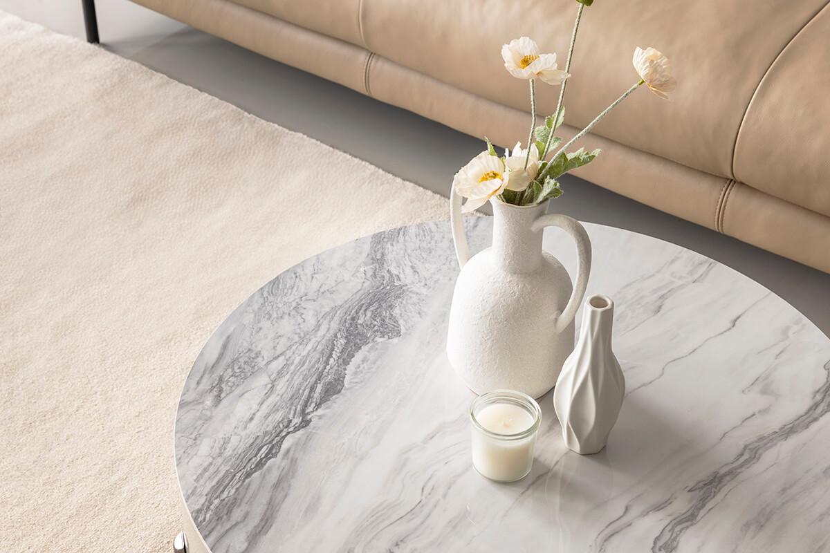 「岩板」的堅毅與「圓弧」的柔潤完美統整。靜止時,它是客廳裡最優雅的聚焦點;